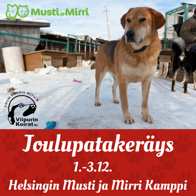 Nummelan Musti & Mirri vastaanottaa lahjoituksia Viipurin Koirille 20.-25.11. Lauantaina 25. päivä klo 11-14 myymälässä järjestetään esittelytapahtuma, jonka yhteydessä on mahdollisuus tutustua yhdistyksen toimintaan sekä nauttia glögistä ja pipareista. Facebook-tapahtuma löytyy täältä.