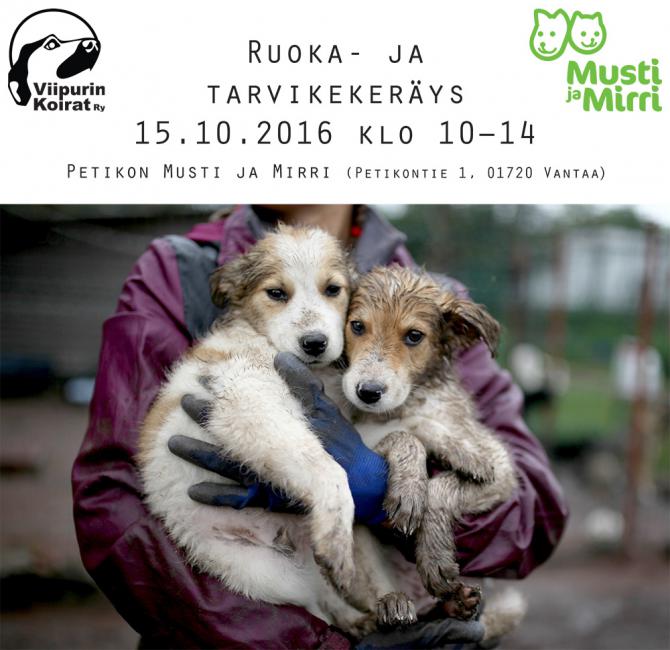 Viipurin Koirat Ry:n ruoka- ja tarvikekeräys järjestetään jälleen Petikon Musti ja Mirri myymälän edustalla lauantaina 15.10. klo. 10-14 (Petikontie 1, 01720 Vantaa).