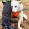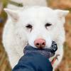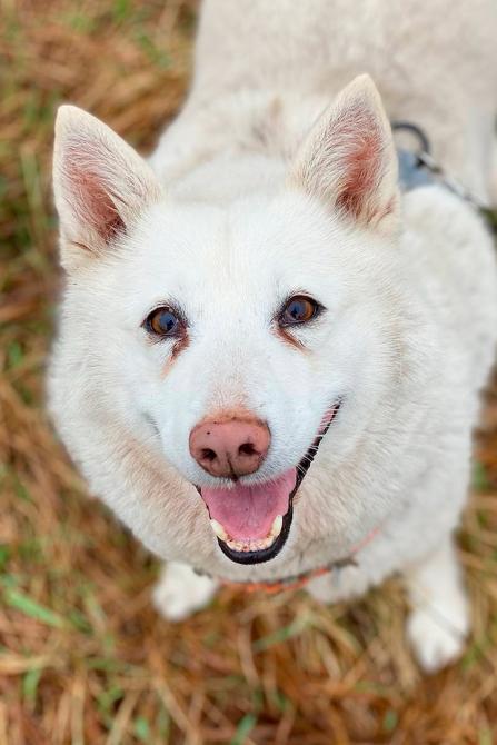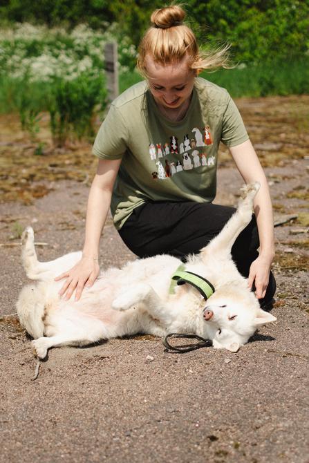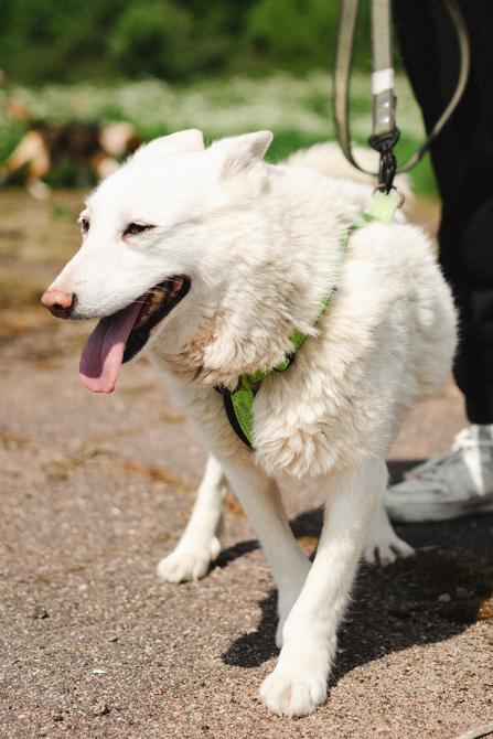 Iloinen koirarouva Belochka sai matkalipun Suomeen. Nyt se odottelee kotiehdokkaita Uudellamaalla.