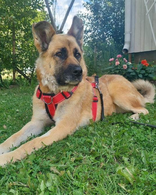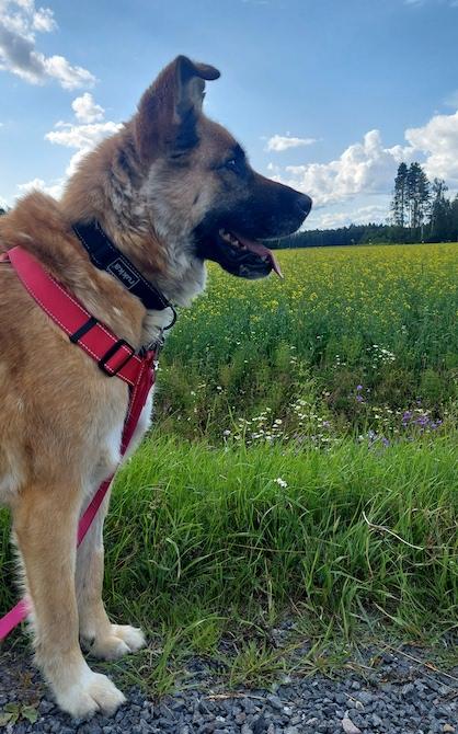 Aluksi Bucha jännitti hoitopaikan omaa uroskoiraa, eikä tykännyt jos se tuli liian innokkaasti kohti. Viikko meni porttien takaa tutustuen. Nyt koirat ovat jo yhdessä samoissa tiloissa ja ulkoilevat yhdessä, eikä ongelmista ole enää tietoakaan. Bucha kuitenkin pärjäisi varmasti oman kodin ainoana silmäteränäkin.