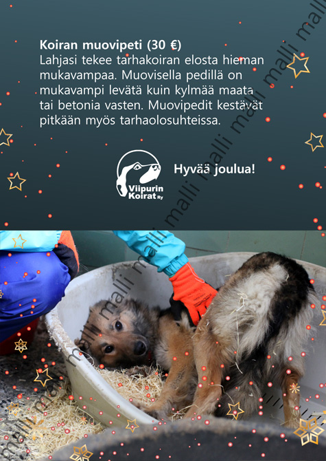 Viipurin Koirien perinteinen joulukeräys onnistui tällä kertaa paremmin kuin koskaan aikaisemmin. Lahjoja ostettiin yhteensä hiukan yli 9000 eurolla, mikä on aivan mykistävän hieno tulos. Ja jokainen sentti on tarpeen. Saimme apua mm. tarhojen arkeen, rakennusprojekteihin ja eläinlääkärikuluihin. Pääsemme keräyksen ansiosta toimittamaan Viipuriin tuiki tärkeitä matolääkkeitä yhteensä 380 eurolla ja lohtua tuovia muovipetejä lähes 700 eurolla. Pentujen starter-ruokaa, emomaidonvastikkeita ja lisäravinteita varten kertyi lähes 2000 euroa ja kummikoira Ollelle kertyi 560 euroa, jolla saatiin melkein katettua sen kipeän silmän poisto. Sekä Olgan taloa että Irinan tarhan klinikkarakennusta voidaan joululahjojen avulla rakentaa askeleen verran eteenpäin.