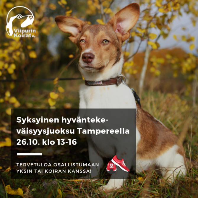 Lauantaina 26.10. klo 13-16 juostaan Viipurin kodittomien eläinten hyväksi Tampereella. Juoksuun voit osallistua yhdessä koiran kanssa tai yksin, juosten tai kävellen. Tärkeintä on nauttia liikunnan ilosta raikkaassa syyssäässä.