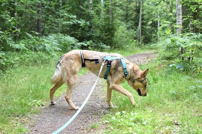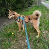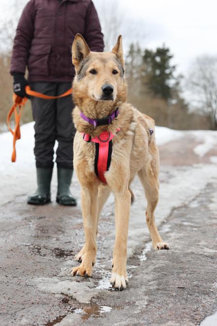 Jarvi jakaa saman aitauksen kahden aikuisen uroksen kanssa ja kolmikko vaikuttaa elävän sopuisasti keskenään. Jarvi pääsi kanssamme pääsiäisviikolla kävelylle esittelemään hienoja hihnakävelytaitojaan. Eipä tosiaan tarvinnut arvailla, onko tyttö joskus aiemminkin kävellyt hihnassa. Tarjosimme Jarville tuomiamme koiranruokia, jotka maistuivat sille hyvin. Ruokahalusta laihuus ei ainakaan tunnu olevan kiinni, mutta tarhalle tilattava ruoka ei valitettavasti ole laadultaan kummoista eikä sovi kaikille.