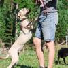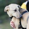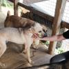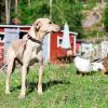 Jerry oli ihan mahdottoman innoissaan nähdessään vieraita tarhalla. Sitä jännitti, mutta silti se halusi samaan aikaan tehdä tuttavuutta. Alkuun Jerryn pää pilkisti avonaisesta kopista, jonka katto oli siirretty sivuun. Siellä poika huiski häntäänsä korvat päähän liimaantuneena ja antoi pusuja. Kun olimme viettäneet pienen hetken aitauksessa, uskaltautui Jerry ottamaan kontaktia vieraisiin ilman turvallista koppia välissä. Se antoi kuitenkin tilaa reippaimmille koirille ja usein myös liukui niiden vanavedessä vieraiden rapsuteltavaksi.