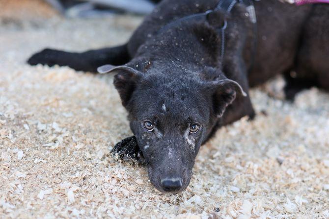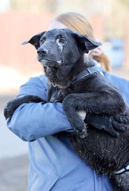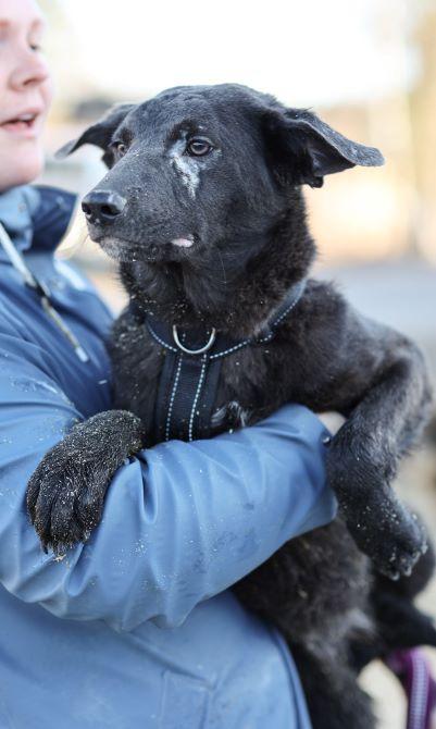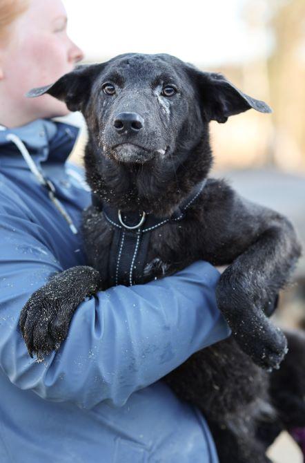 Kainosta on kasvanut pentueen suurin ja sen korvat lerpattavat suloisesti. Tapasimme Kainon ja sisarukset jälleen pääsiäisenä. Tavoitteenamme oli saada kaikki pennut hihnaan ja harjoittelemaan hihnassa kävelyä tarhan ulkopuolella. Myös Kaino onnistuttiin saamaan sylikyydillä tarhan läheiselle pellolle, vaikka kokoa tytölle olikin jonkun verran tullut sitten viime tapaamisen. Kainon olemus tuntui muuttuvan täysin, kun se pääsi tarhan aitojen ulkopuolelle ja rauhalliselle peltoalueelle. Se haastoi suloisesti veljeään leikkiin, kaivoi lumista maata ja teki nenällään itselleen sopivan oloista alustaa. Sitten se heittäytyi maahan makaamaan ja tuntui nauttivan auringosta ja hetken hiljaisuudesta. Vaikka se ei omin jaloin ollutkaan valmis kävelemään tietä pitkin, kantoivat sen jalat hienosti pellolla, kunhan hihna ei kiristynyt. Arvet sen kasvoilla muistuttavat rankasta ja kuluttavasta tarhaelämästä, mutta toivottavasti Kaino saa pian jättää tarhan tylsän arjen taakseen. Se on ihana tyttö ja ansaitsisi jo päästä omaan kotiin.