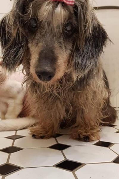 Gerda on mäyräkoiramainen mummokoira, joka saapui Irinan tarhalle syksyllä 2018.