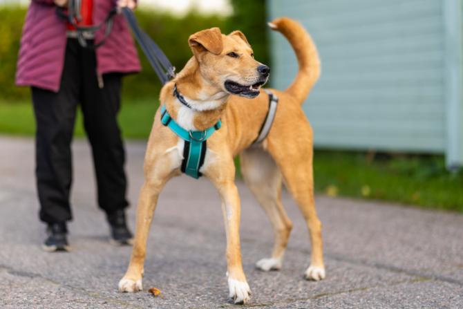 Lora pääsi Elenan kanssa hihnalenkille, mikä on 200 koiran tarhalla harvinaista herkkua. Pitkäsäärinen neiti näyttää kulkevan tottuneesti hihnassa ja nauttii niin kovasti hetkestä laatuaikaa.