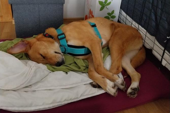 Loran kanssa on alettu harjoitella tärkeitä kotikoiran taitoja. Sisäsiisteysharjoittelu on hyvällä mallilla ja myös yksinoloja on harjoiteltu pienissä erissä.