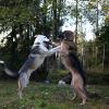 Ulkona oleminen oli alkuun hirvittävän jännittävää, ja tyttö haki paljon turvaa ihmisestä vierellään. Etukäpälät suorastaan takertuivat välillä lantion ympärille, kun pusikossa räsähti tai muuten vaan näköpiirissä oli jotain liian epäilyttävää. Nykyään Mai loikkii jo innoissaan ympärillä häntä liehuen kun hihnoja aletaan ottaa esiin. Metsässä samoilu on Main mielestä ihan parasta hommaa, ja tyttö kulkee reippaasti nenä maassa nuuhkuttaen. Koiraseurassa Mai on huomattavasti reippaampi ulkona kuin yksinään.