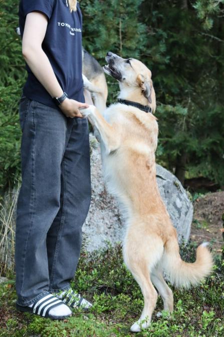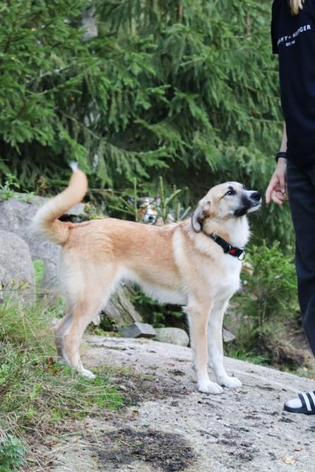 Kuvat kultaturkkisesta Nannasta eivät valitettavasti ole mitään priimaa, mutta asialle ei juuri nyt mahda mitään kun emme itse pääse koiria tapaamaan emmekä kuvaamaan. Nanna on kuitenkin yhtä iloisesti hakemassa herkkuja ja huomiota tutulta ihmiseltä, Elenan aikuiselta pojalta Dimalta. Monenlaista harjoittelua on tietysti edessä, kuten varusteisiin ja hihnakävelyyn totuttelua sekä sisäsiisteyden ja yksinolojen harjoittelua.