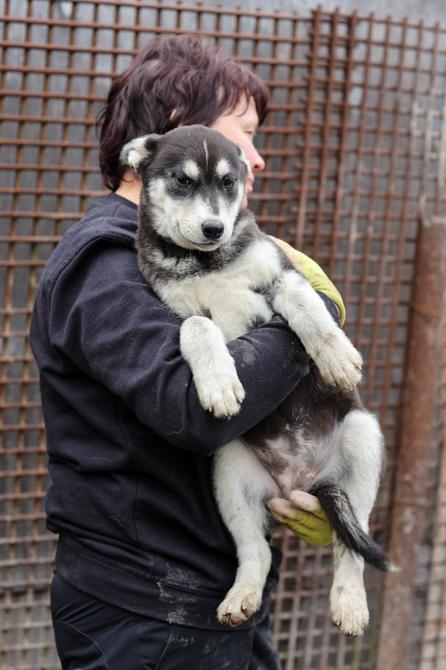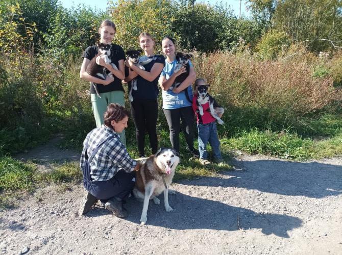 Margaritan tarha sai täydennystä syyskuussa, kun Kamennogorskista peräisin oleva huskyemo pentuineen muutti tarhalle. Emokoira Ravna asui kodissa rauhallisella seudulla omakotitalossa, kunnes lapsen syntymän jälkeen perhe ei halunnut sitä enää sisätiloihin. Ravna laitettiin pihalle ketjuun, missä se virui - tietysti leikkaamattomana - vuoden ketjuansa kaluten. Emme tiedä, onko Ravnalla takanaan useampia pentueita, mutta tämä nelikko jäi viimeiseksi. Omistaja halusi eroon koirista ja tieto paikkaa etsivistä emosta ja pennuista kantautui Margaritalle. Margarita huolehti, että koiraperhe sai asianmukaiset rokotukset kotipihallaan, kunnes karanteenin jälkeen ne muuttivat tarhalle.