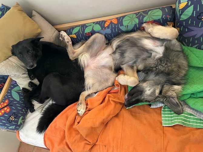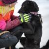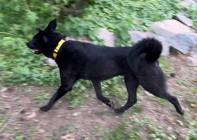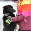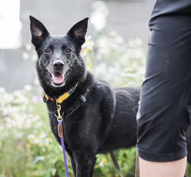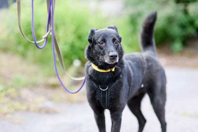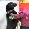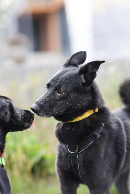 Tammikuisella tarhareissullamme tutustumme erään aitauksen koiriin. Päätämme ottaa asukkaat ulos kävelylle jotta pääsemme tekemään niiden kanssa paremmin tuttavuutta. Kaksi ensimmäistä ovat jonossa jo ihan valmiina, mutta kolmas, tuo musta laiheliini pysyy varjoissa. Emme kuitenkaan jätä sitä aitaukseen kyhjöttämään vaan puemme varusteet sillekin ja kannamme ulos tarhalta.