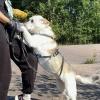 Renja ei vaikuta enää niin surusilmäiseltä kuin tarhalle jouduttuaan. Ainakin yhtenä päivänä viikossa eli sunnuntaisin siitä kuoriutuu iloinen lenkkeilijä, joka ottaa rohkeasti kontaktia namin toivossa.