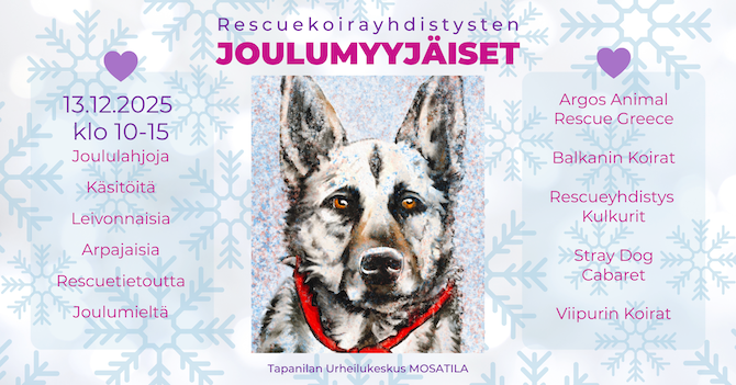 Viipurin Koirat ry järjestää jouluiset myyjäiset Helsingin Tapanilassa neljän muun rescueyhdistyksen kanssa. Myyjäiset ovat osa Tapanilan Urheilukeskuksen koko perheen joulutapahtumaa.