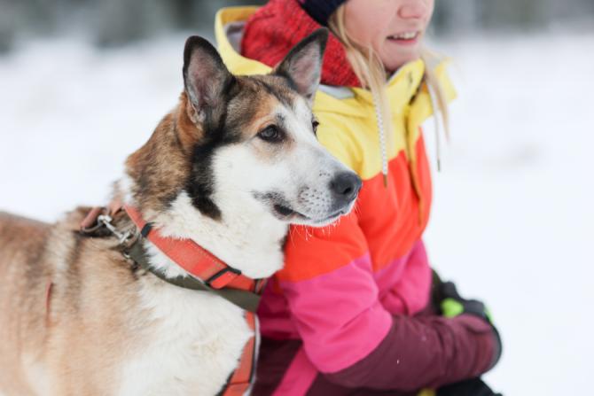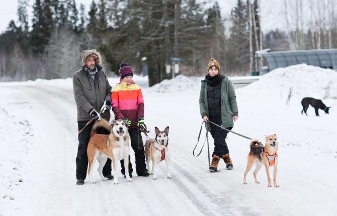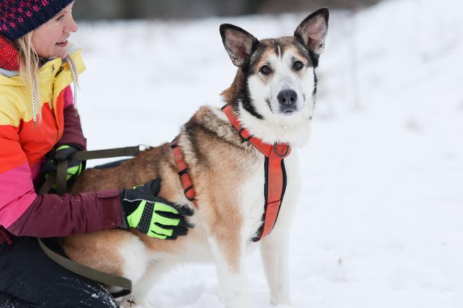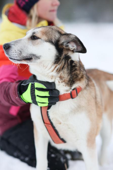 Sahra kävelee hihnassa tottuneesti. Tietysti ilmassa on innostusta ja hihnat menevät välillä solmuun kolmen koiran kanssa, sillä aitauksesta pääsee ulos niin harvoin ja lumisella tiellä jaloittelu, hajut ja maisemat saavat pään pyörälle ilosta. Sahra suhtautuu mukana olleeseen vieraaseen pienikokoiseen urokseen ystävällisen uteliaasti. Pienen tovin kuluttua vierellä kävelee jo oikein nätisti kävelevä tyttö ja Sahran kanssa on mukava kävellä. Se on kiinnostunut ihmisistä ympärillään kesken ulkoiluhetkenkin eikä millään malttaisi olla antamatta pusuja.