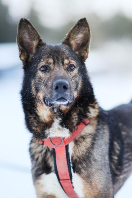 Serge-poika muistuttaa kovasti saksanpaimenkoiraa. Tämä isokokoinen komea koira on viettänyt Elenan tarhalla runsaat kaksi vuotta pienessä aitauksessa.