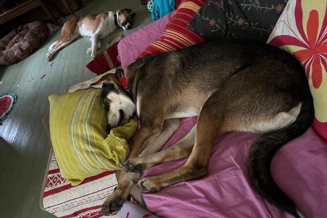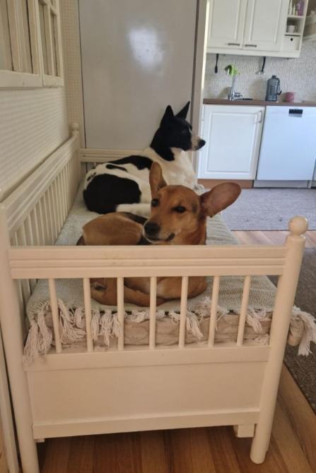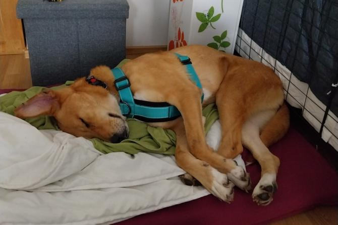 Bono kotihoitopaikassaan kotikoiran perusasioiden äärellä: leikkiä ja lepoa!