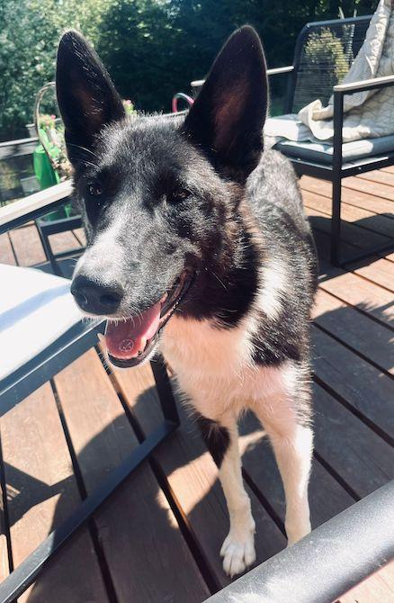Kuulemma olen aika mutkaton koira nykyään, kun olen saanut pahimman arkuuden karisteltua pois. Kyllä oli yhtenä päivänä hoitoäiskä ylpeänä, kun olin selälläni nurmella ja annoin rapsuttaa masusta. Se jos mikä on iso luottamuksen osoitus! Hoitoäiskä kehuu kovasti, kuinka olenkin rohkaistunut ja joka päivä rohkaistun enemmän ja enemmän! Yöllä tykkään ryömiä sänkyyn hoitoäiskän viereen nukkumaan. Osaan myös rauhoittua sisällä, kunhan saan tarpeellisen määrän liikuntaa ja aktivointia. Lempiruokani on maksalaatikko ja juusto. Voi juku mitä makuelämyksiä olenkaan saanut täällä Suomessa, tai vienyt pöydiltä, miten sen nyt sitten haluaa ottaa. Ruoka kun on minulle niin tärkeää. Pystyn kyllä vaikka jakamaan kupin toisen koiran kanssa.
