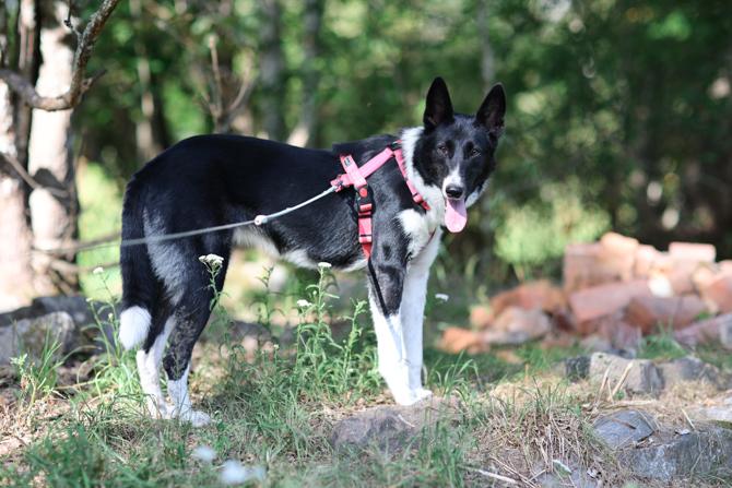 Taiga pääsi kanssamme hihnakävelylle tarhan ulkopuolelle. Hihna oli sille uusi ja jännittävä asia. Kovin montaa askelta Taiga ei uskaltanut ottaa ja aika käytettiinkin melkein kokonaan ympäristön tarkkailuun joko istuen tai maaten. Taiga on sittemmin päässyt vapaaehtoisten kanssa toistamiseen harjoittelemaan hihnassa olemista. Taiga on kovin kaunis mutta varovainen tyttö. Se kuitenkin ilahtuu ihmisistä, mutta ei uskalla noin vain luottaa vieraisiin.