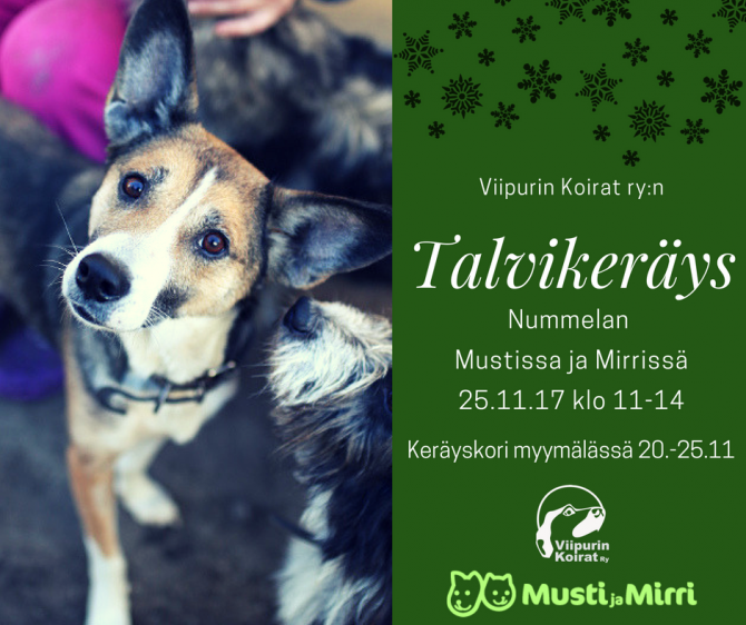 Nummelan Musti & Mirri vastaanottaa lahjoituksia Viipurin Koirille 20.-25.11. Lauantaina 25. päivä klo 11-14 myymälässä järjestetään esittelytapahtuma, jonka yhteydessä on mahdollisuus tutustua yhdistyksen toimintaan sekä nauttia glögistä ja pipareista. Facebook-tapahtuma löytyy täältä.