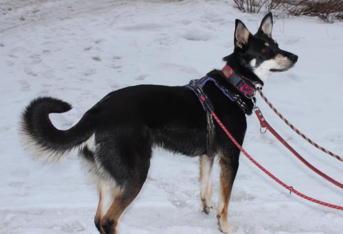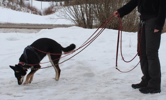 - aluksi koira ulkoilutetaan aina tuplavarusteilla: panta tiukalla, valjaina hyvinistuvat Y-valjaat ja molemmissa oma hihna. Valjaisiin kannattaa hankkia ns. jarruosa, joka estää valjaita liukumasta pois koiran päältä. Kuva löytyy esim. täältä.