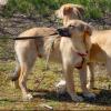Saamme koirat hihnaan ja lähdemme tarhan ulkopuolelle tutustumaan. Pojat eivät ole lainkaan niin arkoja, kuin pelkäsimme, vaikka ottavatkin tukea toisistaan. Kävely on alkuun pelkkää sinkoilua ja törmäilyä sinne tänne. Teddy kuitenkin rauhoittuu pian rapsuttajan kainaloon ja kuvattavaksi. Pojat ovat niin samannäköisiä, että niitä on vaikea erottaa, paitsi yhdestä tuntomerkistä: Timillä on poikkeukellisen lyhyt alaleuka, kun taas Teddyn naama ja hammaskalusto on normaalin sorttinen.