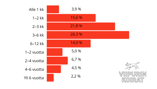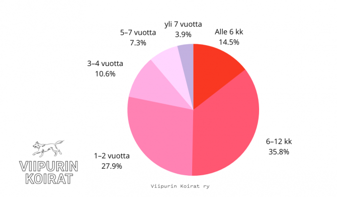 Enemmistö koirista päätyi löytökoiratarhalle alle puolivuotiaana pentuna. Alle luovutusikäisten pentujen osuus pieneni edellisestä vuodesta, sillä pennut pyrittiin pitämään entistä pitempään muualla, mieluiten emonsa kanssa, ja huolehtimaan siitä, että niiden rokotusstuoja oli kunnossa ennen löytökoiratarhalle päätymistä.