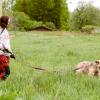 Trinaa on yritetty aiemmin saada hihnaan, mutta tuloksetta. Aitaus on iso ja Trina mahtuu siellä olevien lattialautojen alle, minne se onkin usein piiloutunut huomatessaan että sitä yritetään ottaa kiinni. Huhtikuussa Trina kuitenkin antoi kiinni ja saimme kolmen ihmisen voimin tytön ulos aitauksesta, ensimmäistä kertaa sen elämässä. Jännityksestä huolimatta Trina antoi käsitellä itseään nätisti ja kunhan sen kanssa oli hetki tasattu hengitystä, istui se sylissä maisemia katsellen. Trinan omat jalat eivät montaa metriä kantaneet ja kiristyvä hihna aiheutti siinä panikoitumista, mikä on ymmärrettävää sillä olivathan varusteet sen päällä vasta ensimmäistä kertaa elämässä. Aitaukseen takaisin päästyään Trina muuttui takaisin omaksi, iloiseksi itsekseen, mutta saattoi kyllä mielessään pohtia, että mitähän ihmettä juuri äsken tapahtui.