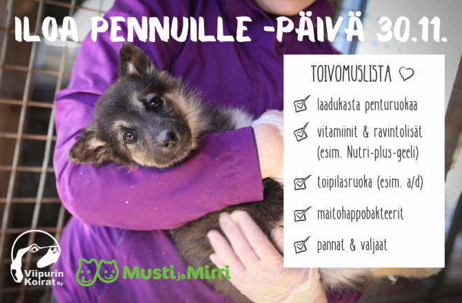 Tervetuloa viettämään kanssamme Iloa pennuille! -päivää Keravan Musti ja Mirri -myymälään (Prisma Kerava, Kauppakaari 2) 30.11. klo 11-14! Olemme tuolloin paikalla myymälässä esittelemässä toimintaamme sekä ottamassa vastaan lahjoituksia.