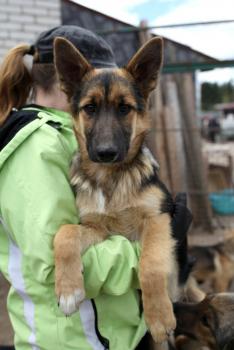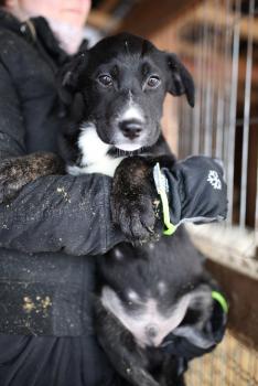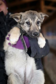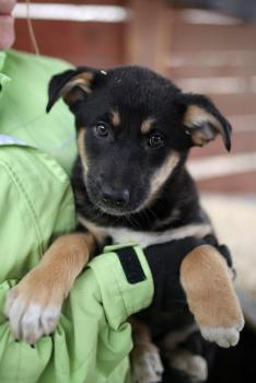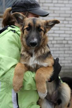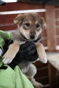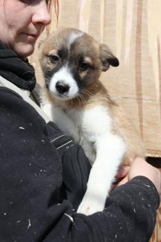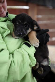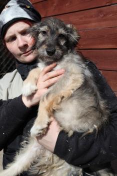 Vieraat ihmiset vielä ujostuttaa Medaa ja se katselee tulijoita turvallisesta sopukasta muiden pentujen lomasta. Mistä tyttö löytäisi sitoutuneen ihmisen?