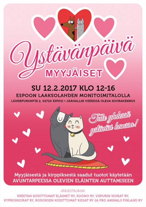 Tule tutustumaan eri yhdistysten toimintaan, maistelemaan buffetin herkkuja, tekemään kirpparilöytöjä ja ostamaan ihania ystävänpäivälahjoja. Tapahtuman tuotot käytetään hädänalaisten eläinten auttamiseen eri maissa.