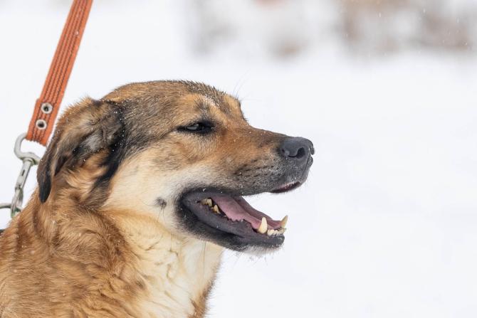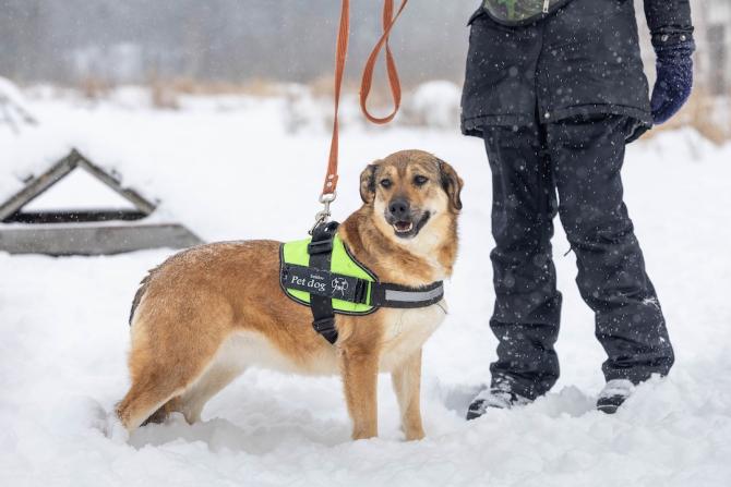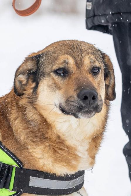 Istumme helmikuun puolivälissä Hloyan aitauksessa rapsuttelemassa koiria. Snezhanna on mukanamme ja osoittaa uteliasta nuuhkijaa vieressämme: "It's Hloya!". Olikin yllätys, että se on niin reipas. Hloya haluaa lähteä mukaamme hihnakävelylle ja niinpä lähdemme kolmen koiran kanssa lumiselle aukiolle. Vaikka Hloyaa hihnassa oleminen hiukan jännittääkin, on se suurimmaksi osaksi innoissaan ja valmis leikkeihin kavereiden kanssa. Hloya tulee reippaasti syömään käsistämme herkut eikä se muutenkaan sen kummemmin arastele kosketusta. Tutun ihmisen luokse se on ihan muina koirina hivuttamassa itseään rapsutukset mielessä. Liian kauas ei saa koirakaverit kadota, silloin iskee hätä.