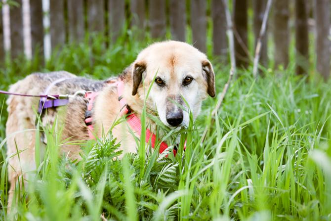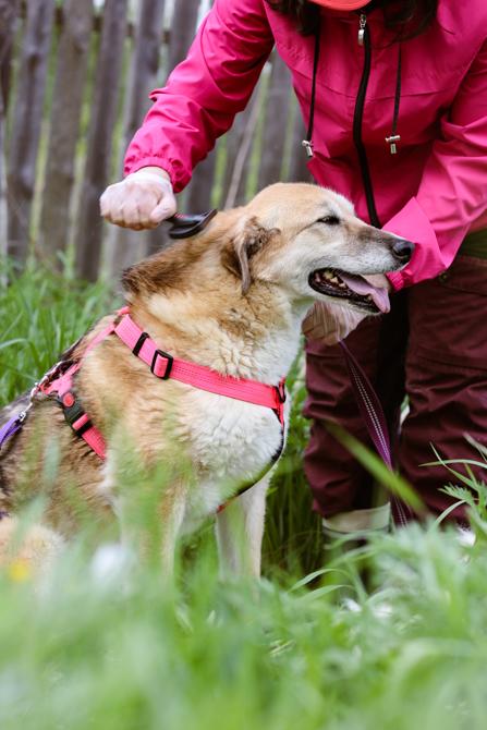 Viime viikolla päätimme, että nyt on Iriksen aika päästä ulos aitauksestaan. Jännityksestä huolimatta Iris on hyvin kiltti tyttö, jolle varusteiden saaminen kävi loppujen lopuksi melko näppärästi. Se kannettiin sylikyydillä ulos aitauksesta ja laskettiin ensimmäistä kertaa vuosiin tarhan ulkopuolelle. Luonnollisesti Iris oli jännittynyt ja hiukan peloissaan, mutta se söi nameja ja alkoi hiljalleen rentoutua sen verran, että otti jo askeleita. Sen menoa oli liikuttavaa seurata. Iris hiippaili vuoron perään kaikkien meidän luokse, suikkasi pari pusua naamalle ja jatkoi eteenpäin. Iris on niin liikuttava ja ihana tyttö, että sen loppuelämä ei kerta kaikkiaan voi kulua tarhalla. Sille on löydyttävä koti.