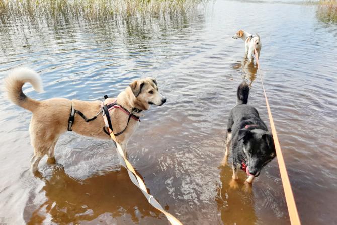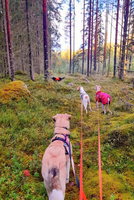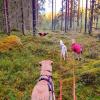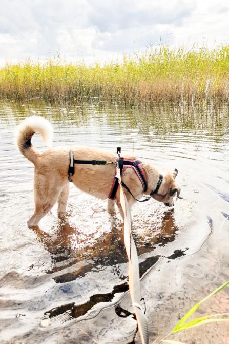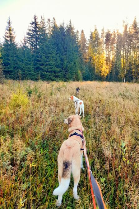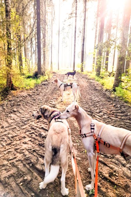 Lenkkeily on noussut Laran suosikkipuuhaksi. Vaikka alkuun ulkoilu jännitti, nykyään metsälenkit saavat aikaan iloisia hypähdyksiä valjaiden nähdessä. Lara kävelee nätisti hihnassa. Lenkit tehdään aina kodin koirakaverin kanssa, välillä mukana on jopa talouden kaikki neljä koiraa.