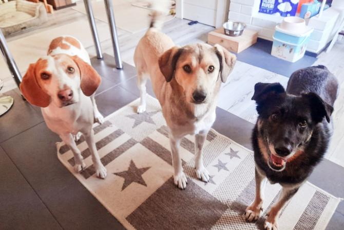 Tyttäret, varsinkin toinen niistä, on reipas mutta Lara, voi Lara, se on huolestunut ja peloissaan. Minne se onkaan joutunut. Kun astumme aitaukseen, katselee Lara meitä kopin suulta, joka on turvallisin paikka uusien ihmisten tarkkailuun. Aikansa tuumailtuaan se tulee hakemaan myös nameja käsistä ja heiluttaa häntäänsä korvat höröllä. Lara pitäytyy sivummalla ja antaa tilaa muille koirille. Sen olemus on hyvin huomaamaton.