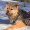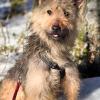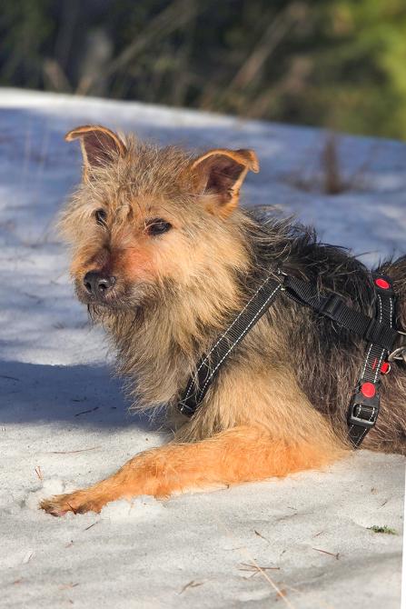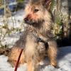 Elena puki Neddille varusteet ja kantoi pojan mukanaan tarhan ulkopuolelle kuvattavaksi aiemmin tässä kuussa. Kyseessä oli Neddin ensimmäinen ulkoilukerta. Aivan kuin eri puolilta kehoa puristavissa epämukavissa naruissa ei olisi ollut riittävästi pureksittavaa, kiristyneestä talutinhihnasta syntyvä paineen tunne sai aikaan muutaman paniikinpoikasen (joista selvittiin, kiitos jarrupalan!). Matka itsessään oli melko lyhyt, ja Neddi taittoi sen pääasiassa omin tassuin tuumaustaukojen kera. Metsätiellä se malttoi istua ja nuuhkia ilmaa sekä ympäristöä, mutta reissu oli sen verran jännittävä, etteivät Elenan namit uponneet. Seuraavia ulkoiluharjoituksia toivomme Neddin jatkavan omassa kodissa reippaan koirakaverin tukemana.