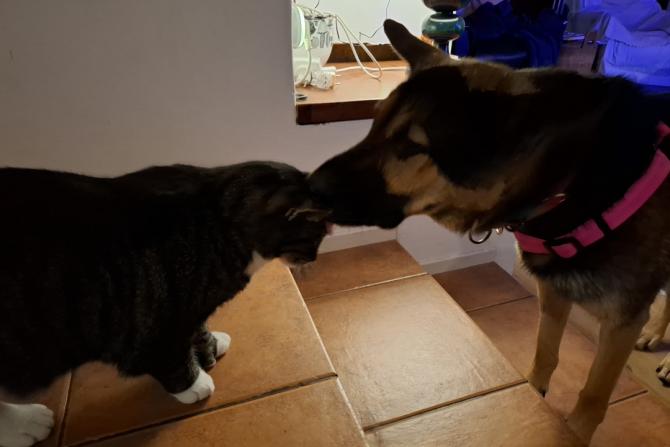 Nadia on jo kaverustunut oman kodin kissan kanssa.
