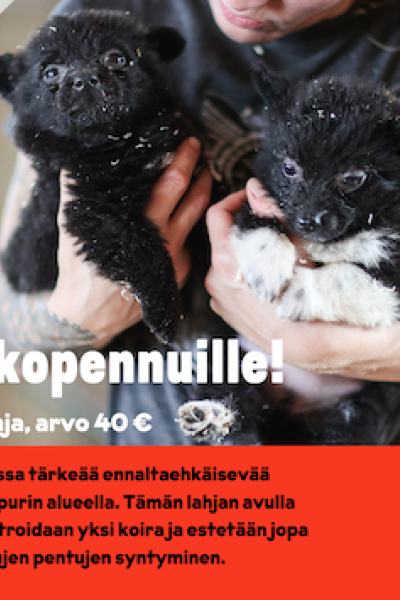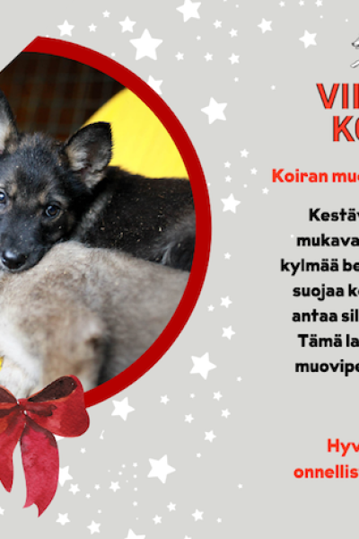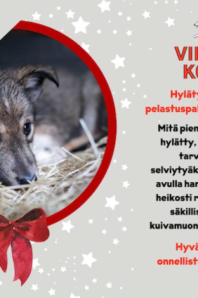 Viipurin koirien eettiset joululahjat ovat tilattavissa. Valikoimassa on tänä vuonna 10 erilaista lahjaa, arvoltaan 6–200 euroa. Eettisen lahjan ostaja saa sähköisen kortin, jonka voi lähettää joulutervehdykseksi ystävälle sähköpostilla tai Whatsappilla, tai tulostettuna. Keräykseen voi toki osallistua muutenkin! Lahjasta riittää iloa niin sen saajalle, antajalle kuin koiria hoitaville työntekijöille ja vapaaehtoisille – ja ennen kaikkea tietysti koirille.