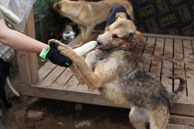 Se loikki ja pomppi ja samaan aikaan kävi napsimassa herkut parempaan talteen. Lähellä oleminen selvästi kuitenkin vähän jännitti sitä, sillä välillä piti ottaa hiukan etäisyyttä ja ravistella jännitystä pois, eikä lähelle vielä ihan uskaltanut jäädä. Lisäksi häkin ulkopuolelle kuikuilemaan tullut vieras koira sai luvan lähteä lätkimään. Tämä on varsin tavallista, kun koira on kierroksilla jostain, joten varsinaisia johtopäätöksiä koiran luonteesta siitä on vaikea tehdä. Trina on hyväntuulinen ja positiivinen koira, joka todella ansaitsisi päästä jo kotiinsa.