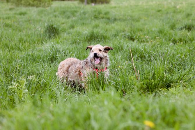 Lieneeköhän kauniiseen Trinaan eksynyt tippa airedalenterrieriä. Punertava karva kihartuu kauniisti ja koko olemus on hyvin terrierimäinen. Trina on nyt kolme vuotta, ja se on ehtinyt viettää tarhalla käytännössä koko ikänsä.