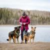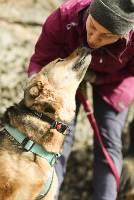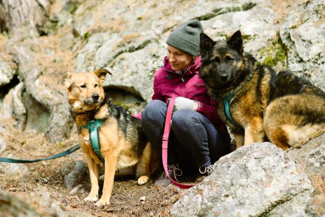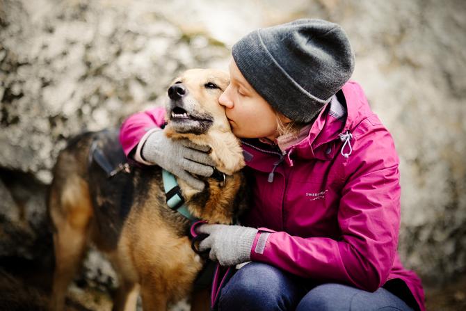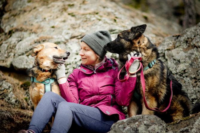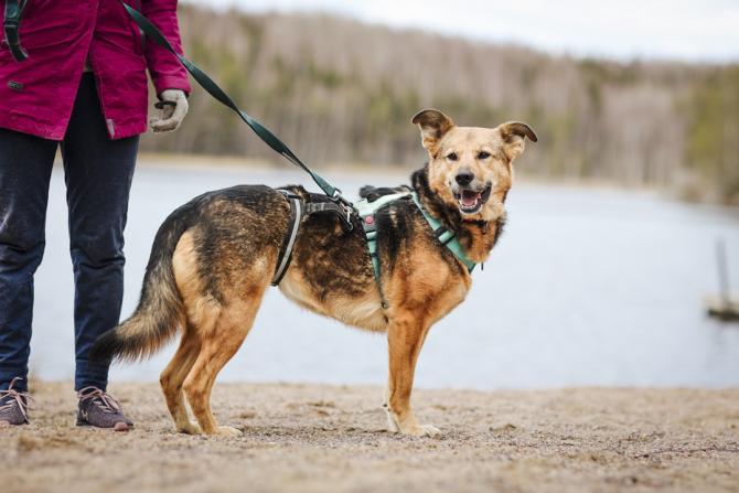 Toukokuun puolivälissä teemme tarhareissun Elenan luokse. Käymme läpi aitauksia ja niitä koiria, joihin emme ole vielä tutustuneet. Unnassa on jotain tuttua ja muistamme tytön jo ajalta ennen koronaa. Vieläkin täällä. Unna on hiukan varovainen ja se antaa tilaa vieressä säheltävälle ja innokkaalle urokselle. Sitä jännittää, mutta siitä huolimatta se haluaisi tulla kainosti tekemään tuttavuutta. Pienessä aitauksessa ei saa rauhallista hetkeä ja huomion vie muutenkin aitaustoveri, joka tunkee väliin antamaan pusuja. Unna puetaan varusteisiin ja kannetaan ulos.