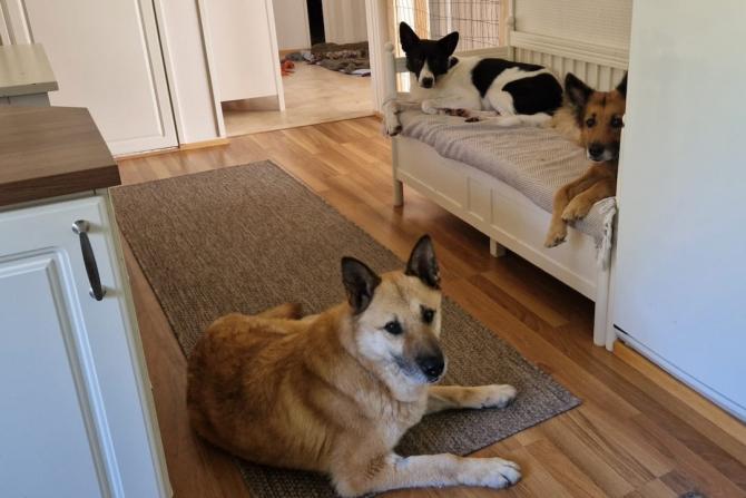 Dante on osannut jäädä hienosti kotiin ihmisten työ- ja koulupäivien ajaksi ja yksinolot ovat sujuneet alusta asti rauhallisesti nukkuen. Dante on toistaiseksi viettänyt nämä ajat omassa huoneessaan, josta näkee verkkoportin lävitse muut koirat.