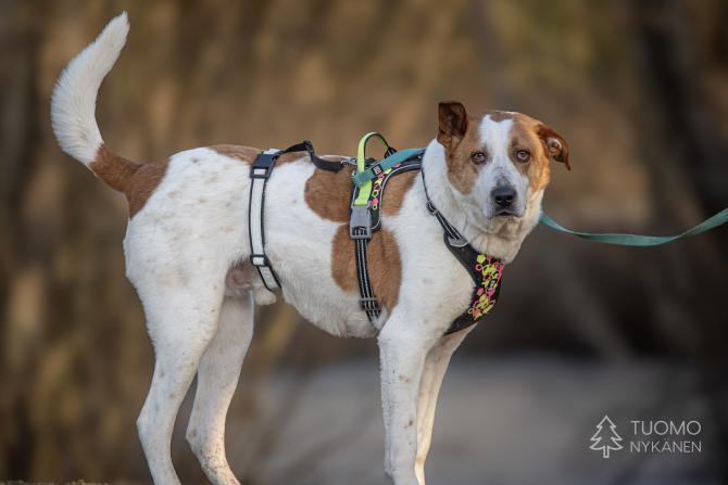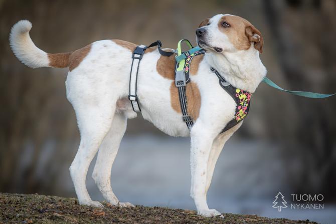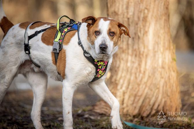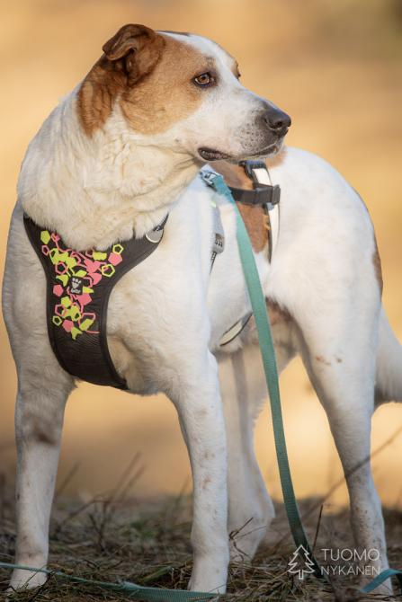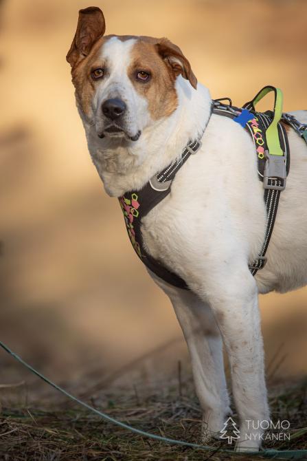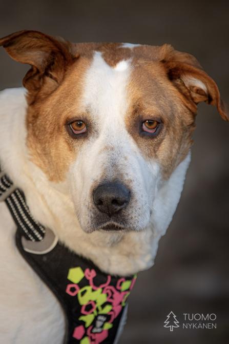 Douglasilla on ollut koti, mutta emme tiedä onko se saanut asua sisällä ja millaisia taitoja sille on opetettu. Douglas on iso poika ja se on tottunut kulkemaan hihnassa, mutta kovin heiveröinen omistaja saattaisi vain lennellä hihnan perässä jos jokin arvaamaton tilanne sattuisi eteen. Ruista saisi siis olla ranteessa jonkin verran. Douglas vaikuttaa muuten melko mutkattomalta kaverilta, jonka suuri sydän sykkii kovasti ihmisille. Tässäpä olisi suurten koirien ystäville mahtava, ihmisläheinen poika, joka voisi olla elementissään maalla omakotitalon tiluksia vahtien.