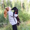 Suloinen pikkutyttö Eila kiepsahtaa selälleen taluttajan jalkojen juureen. Ensimmäinen ulkoilu jännittää ja turvallisempaa onkin pysytellä ihmisen sylissä.