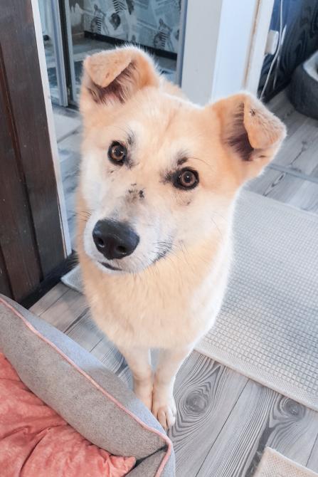 Suukotteleva pumpulipallo Fifa saapui maaseudulle hoitopaikkaan kuukausi sitten. Uudet ihmiset ovat Fifasta jännittäviä ja se etsiikin koirakaverellista kotia.