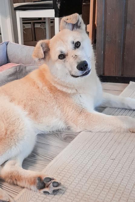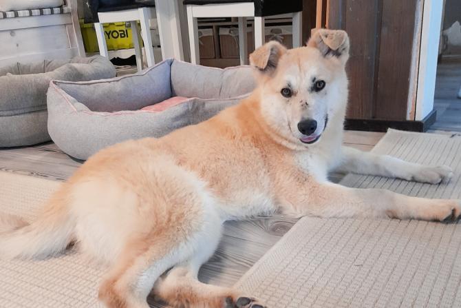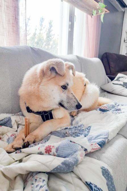 Voi mahdoton, mikä häntää vispaava ihana pusukone sieltä Suomeen matkasikaan! Reipas Fifa jatkaa oman kodin etsintää hoitopaikasta käsin.