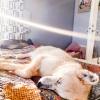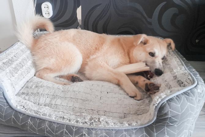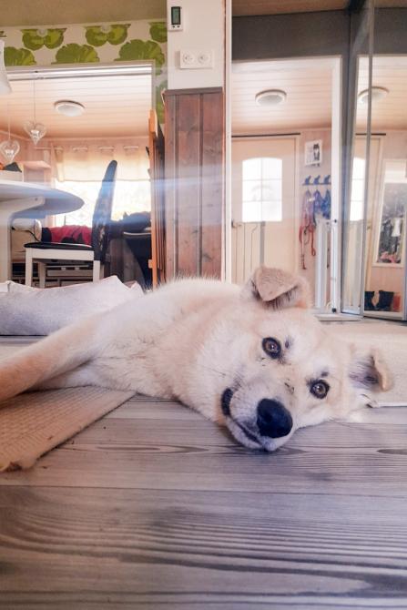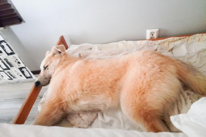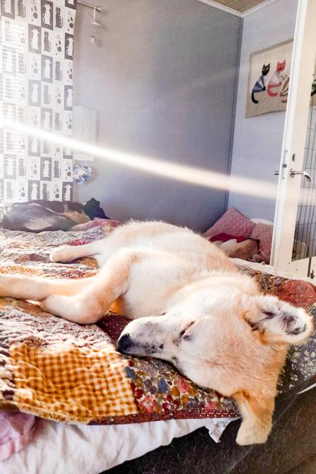 Yksinolot työpäivien aikana ovat sujuneet hyvin. Vain sängynkulman kangas on saanut pienen maistiaisen, mutta muuten Fifa on tyytynyt jyrsimään puruluitaaan ja näkemään unia.