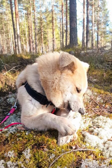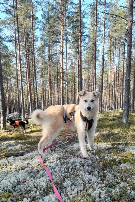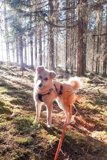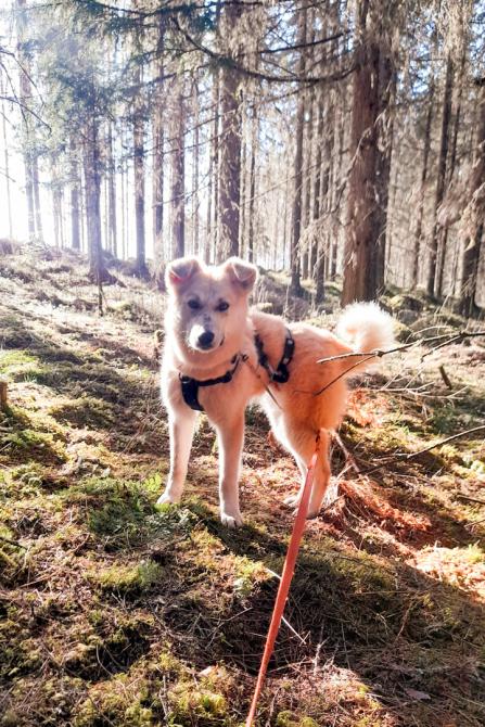 Viikkojen aikana Fifasta on kehkeytynyt mainio lenkkeilykaveri. Se kulkee nätisti hihnassa ja usein myös pitkässä liinassa, sillä täällä tykätään samoilla metsäpoluilla. Metsäretket ovatkin Fifan mieleen!