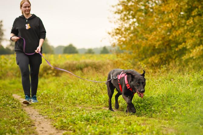 Kävelyllä Irma on toistaiseksi vain vilkaissut ohi kulkevia ihmisiä ja hiukan kauempana näkynyt koira aiheutti vain vähäistä mielenkiintoa. Hihnakäytös voi toki ajan kuluessa muuttua, sillä kotiutuminen on vielä aivan alussa. Naapurin labbispoikaa se tervehti hihnassa ystävällisesti.