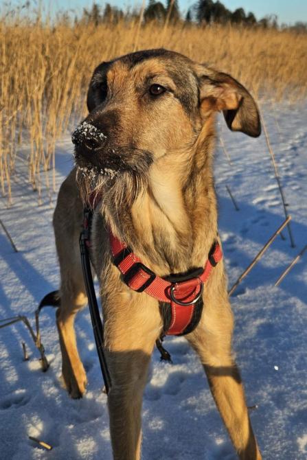 Suloisella pikku parralla varustettu Jella on onneksi saanut tarhallakin nauttia ihmisten seurasta, ainakin sunnnuntaisin vaoaaehtoisten lenkityspäivänä. Jella onkin tutustunut monenlaisiin ihmisiin ja valjaat sekä hihna ovat myös tulleet tutuiksi.